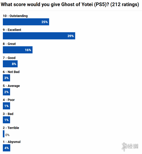 截止到发稿时为止,该调查一共收到了212份投票,其中10分(杰出的)占比25%,而9分(极好)占比最高,为39%,此外,也有16%的玩家给出了本作8分(非常好)的高评价。总的来说,绝大部分玩家对于此次《羊蹄山之魂》的表现都是很满意的。