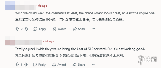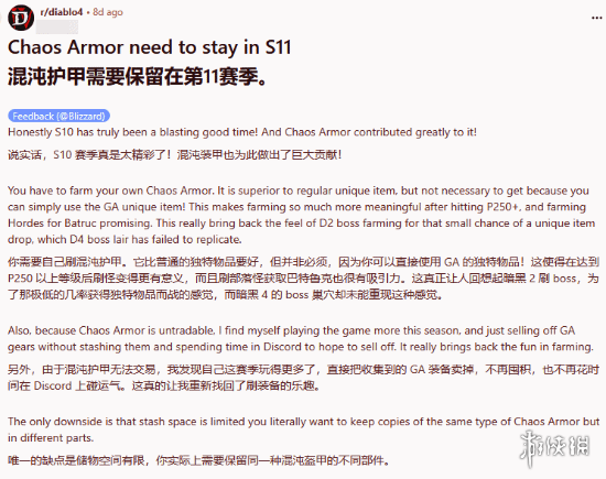 外国论坛Reddit上,甚至还有不少玩家发帖请愿,希望“混沌防具”装备不要在下个赛季移除,并表示“它真正让刷装备重新变得有趣”。
