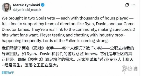 Marek在帖子中表示:“我们特邀了两位资深魂系游戏玩家——他们各自拥有数千小时的游戏时长——全职加入我们的团队,协助包括Ryan、David以及游戏总监James在内的核心创作团队。他们将成为我们与玩家社区沟通的真正纽带,确保《堕落之主2》能够精准捕捉到粉丝的期待。目前,玩家测试和与业内专家的交流正在密集开展。