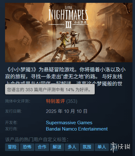 《小小梦魇3》现已正式发售。据Steam平台截至发稿前的最新数据,该游戏在简体中文区的评价已降至“特别差评”,好评率仅为14%。而全球总评则为“褒贬不一”。