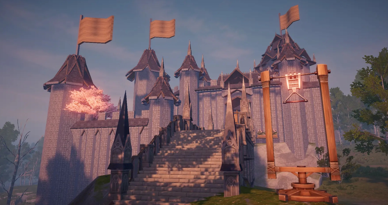 建材风格上,比较贴近城堡风格的建材为山岩系列和暮色圣堂系列,这两种建材在质感上都有种极为厚重的气息,尤其在拿它们建造城堡的外部围墙时,整体的效果相当出色。而且这两种建材都有非常多的样式可选,搭配上荒原曙光那极为独特的建材角度微调功能,可令人们轻松搭建出想要的城堡外观,而且还不会显得四四方方的。更能通过不同建材的组合,搭建出拱顶、立柱等建筑造型,并把它们安放在合适的位置上,好让建筑充满着各种各样的城堡元素。这过程中各位可素以地去实现自己的创意,即便搭建出来的效果不好,也可随时回收建材重新调整,直至城堡的外观令自己满意为止。