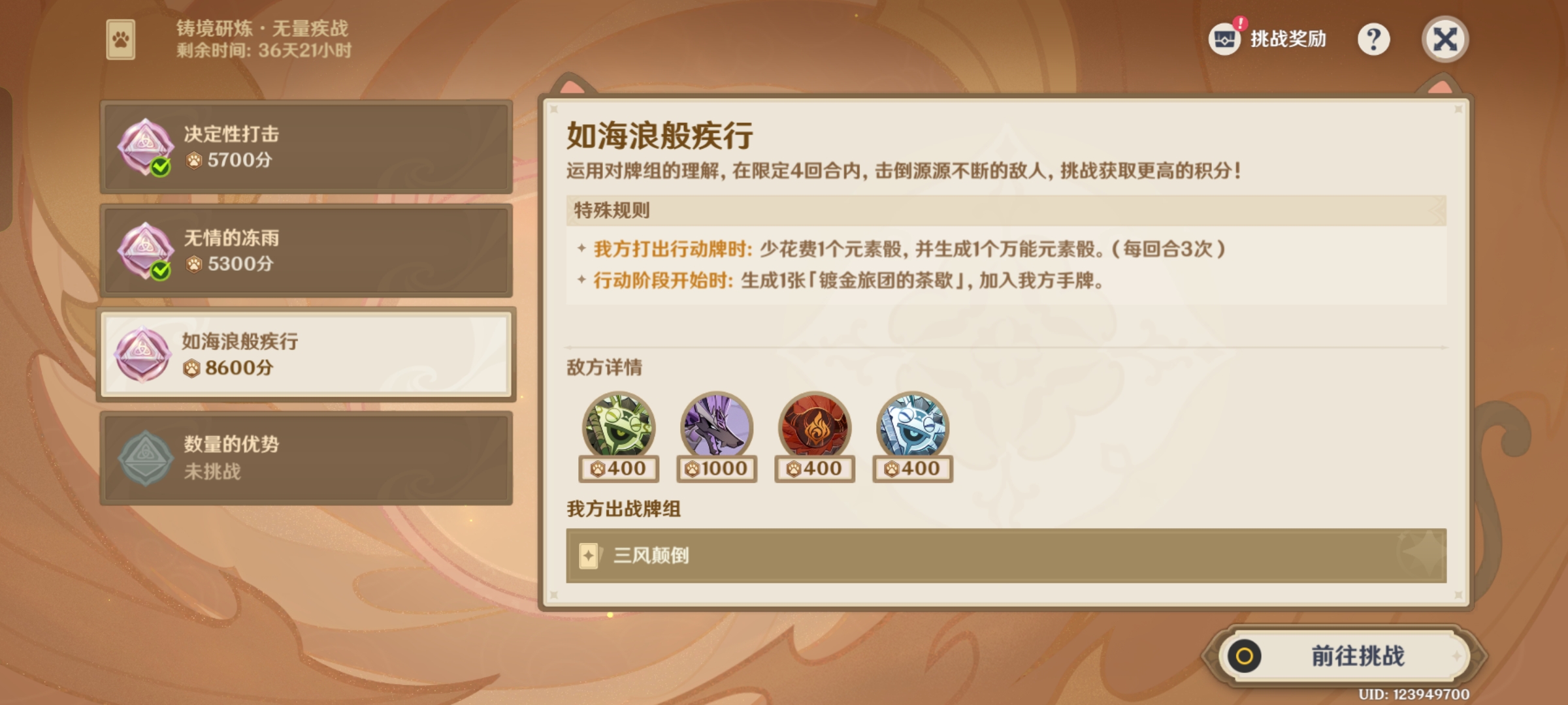 原神 新铸镜研炼·无量疾战怎么过,下面为大家带来《原神》新铸镜研炼·无量疾战3000分通关攻略,按照下方打法只拿奖励3000积分绰绰有余,其实按照下方的打法最低也是5000分,赶快来试试吧。