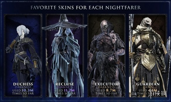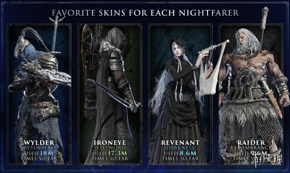 紧接着揭晓的是各角色的皮肤使用频率。使用率最高的追迹者皮肤为“深渊漫步”,累计达1800万次;第二名是鹰眼的“佣兵骑士”,达1730万次。通过这些间接数据,也能一窥玩家对特定角色的使用偏好。