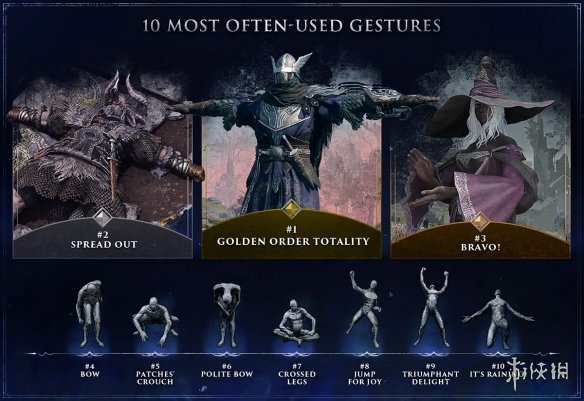 在肢体动作使用排行榜中,第一名是“黄金律法全貌”,第二名是“大字躺”,第三名是“鼓掌”。而魂系列经典的“帕奇蹲”也成功跻身第四。