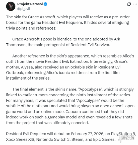 该皮肤名称“Apocalypse”与系列第九部作品的早期传闻密切相关。多年来,外界一直推测该作的副标题将为“Apocalypse”,并可能引入开放或半开放世界设计以及在线玩法。卡普空方面也曾确认,确实尝试过此类玩法方向,甚至公布过一些最终被取消的项目截图。