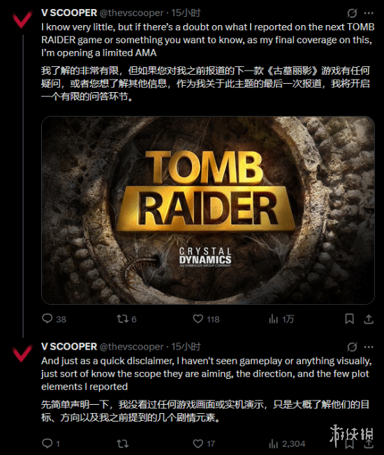 知名爆料人V SCOOPER近日于社交媒体平台开展简短粉丝问答活动,就《古墓丽影》续作相关信息作出回应。需特别说明的是,其明确表示未接触任何实际游戏画面或实机演示素材,仅基于开发团队战略方向进行信息披露。