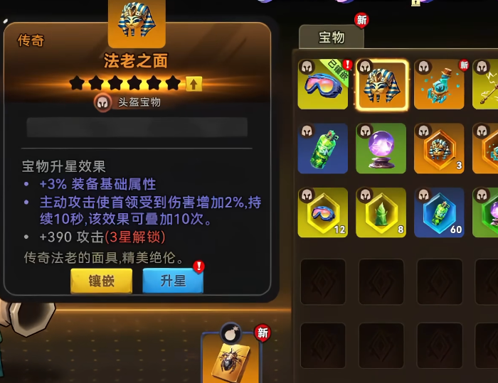 宝物装配策略应以流派为核心,分阶段侧重:首选直接提升伤害的宝物;其次补充技能增益类;最后根据战斗场景动态调整。具体部位推荐如下: