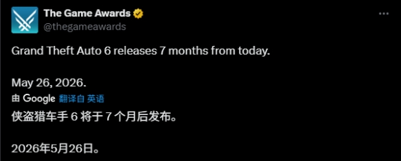 今日,TGA官方在社交媒体上发布消息提醒玩家:《 侠盗猎车手6 (GTA6)》将在7个月后,也就是2026年5月26日正式发售。