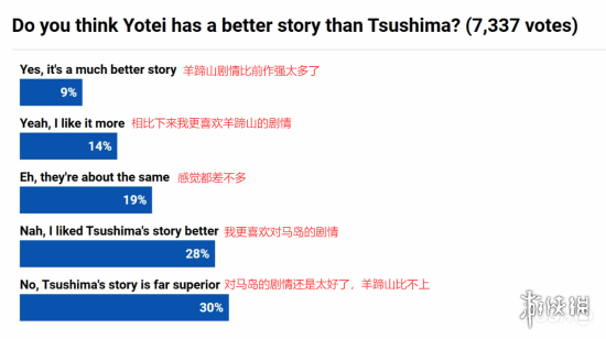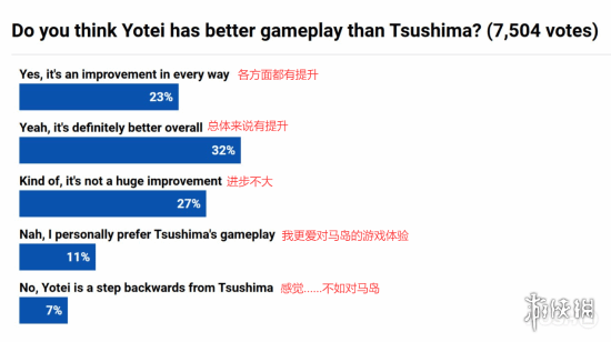将游戏性作为核心评判维度,《羊蹄山之魂》的胜出毫无悬念:82%的玩家肯定了其显著进步。细分来看,23%的玩家视其为全面超越之作,而认为其退步的玩家比例仅为7%,两者对比悬殊。
