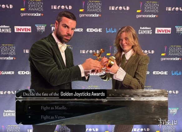 在2025年金摇杆游戏大奖颁奖典礼落幕之际,官方推特发布了一张《 光与影:33号远征队 (Clair Obscur: Expedition 33)》团队手捧七座奖杯的合影,庆祝该作在本届颁奖礼上取得的辉煌成绩。图片配文以游戏中的经典抉择“维尔索还是玛埃尔”作为互动梗,迅速引发玩家社群热议。