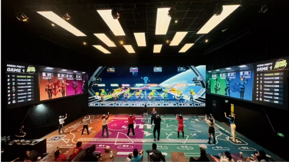 该融合厅的核心亮点"Mirra奇镜派对"VR大屏互动游戏,依托先进的多源融合动作捕捉系统,结合实时8K渲染与AI互动视觉生成技术,实现了多人即时动态成像的沉浸式体验。影厅配备了电影LED屏幕、左右效果LED屏及效果天幕LED幕,300㎡室内双层空间与101㎡三面LED巨幕游戏互动屏相结合,整体画面输出标准达到4K分辨率。