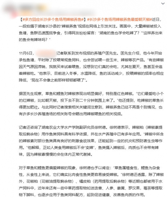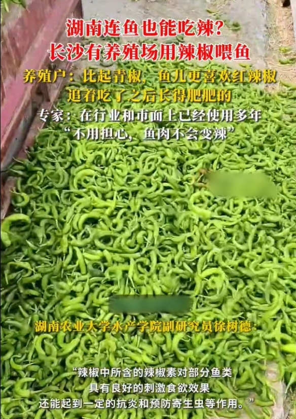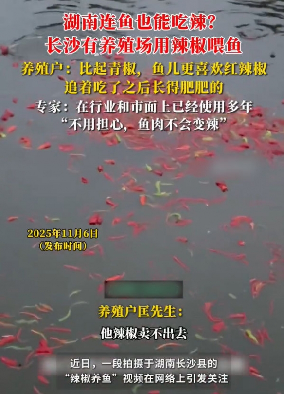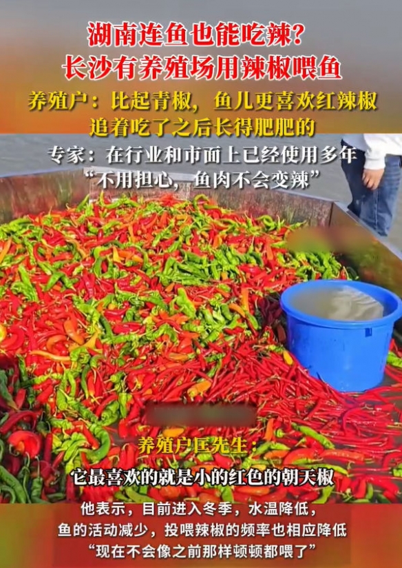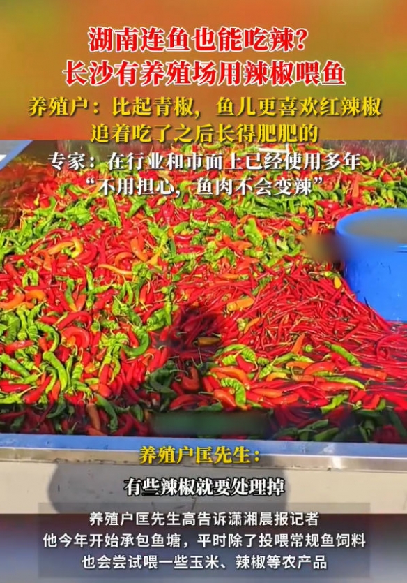 在长沙,辣椒养鱼已经不再是个别现象。许多养殖渔场都在社交平台上分享用辣椒喂鱼的视频,吸引了大量关注。这种既传统又创新的养殖方式,不仅降低了成本、提升了鱼的品质,还为农产品滞销问题提供了新的解决思路。