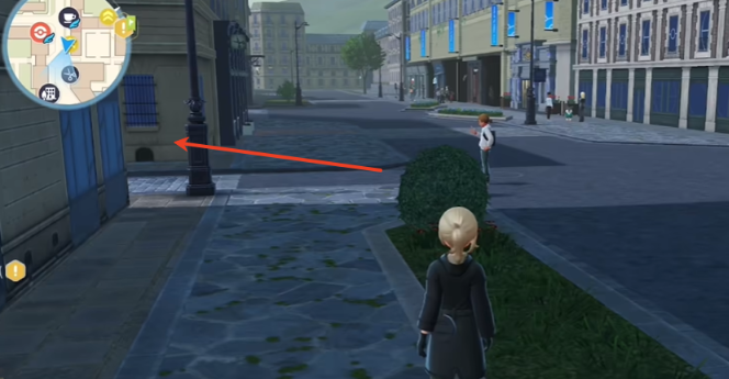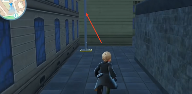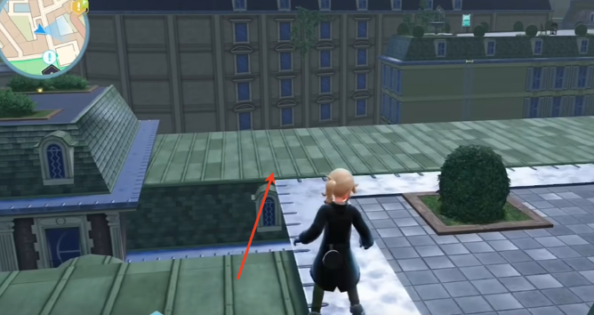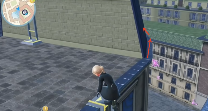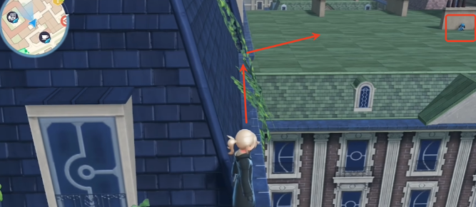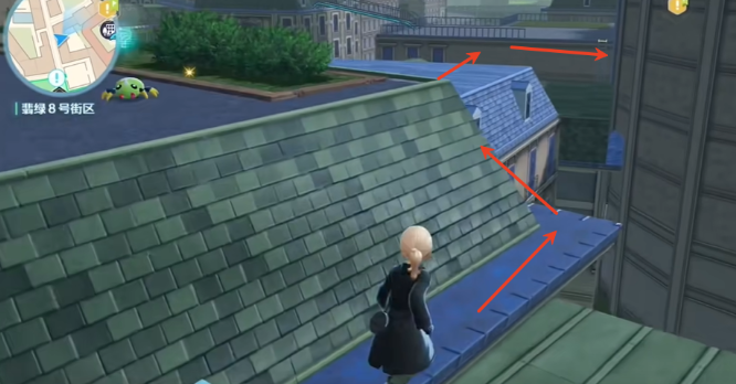 根据箭头走,到达对面楼的侧面位置爬梯子。