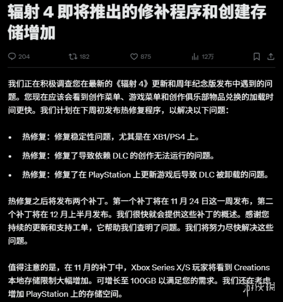 B社似乎也坐不住了,发文承诺将解决DLC失效的异常和其他BUG,下周初将发布热修复。"我们正在积极调查《辐射4》最新更新与周年纪念版上线后出现的各类问题,创作菜单、游戏菜单及Creation Club物品兑换的加载速度现已提升。特别针对Xbox One与PS4平台,同时修复依赖DLC的创作内容失效问题,以及PS平台更新游戏后DLC自动卸载的严重BUG。”