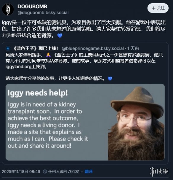 近日,Dogubomb团队向玩家社区发出紧急求助——团队核心成员、首席测试员Iggy被诊断出患有“成人型多囊肾病(ADPKD)”,亟需进行活体肾移植以挽救生命。