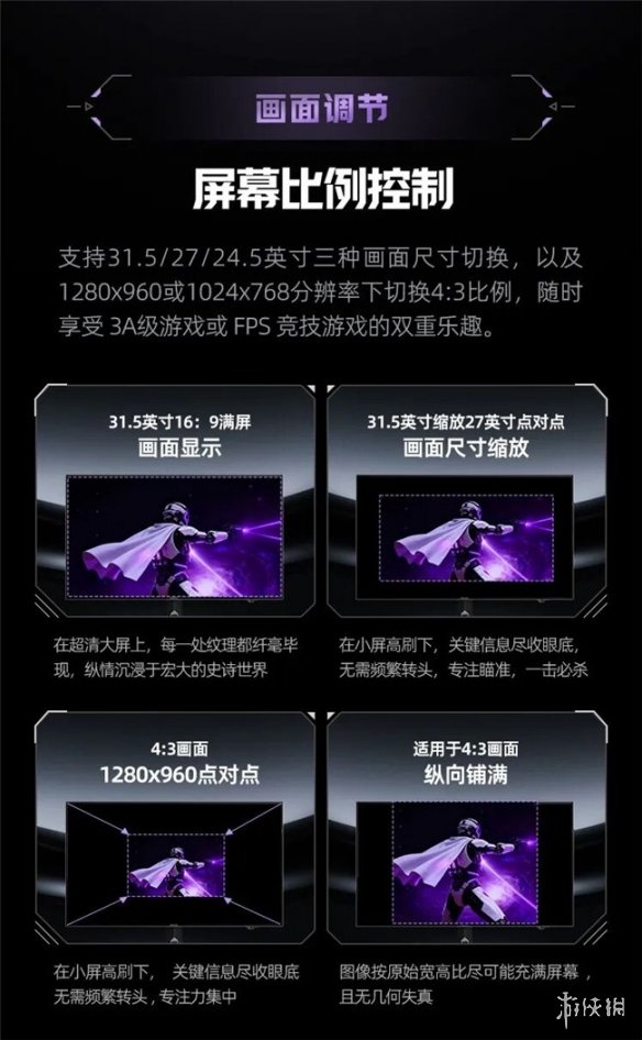 针对多任务与专业竞技需求,AGP327UZD 支持 PBP 双画面和 PIP 画中画功能,可实现多源信号同步显示,让用户能够边游戏边查资料或处理工作任务。KVM 一键切换功能让双设备共用一套键鼠,办公与娱乐切换自如,无需频繁插拔,极大提升工作与游戏效率。同时,支持31.5/27/24.5英寸三种画面尺寸切换,以及1280x960或1024x768分辨率下切换4:3比例,随时享受3A 级游戏或FPS 竞技游戏的双重乐趣。