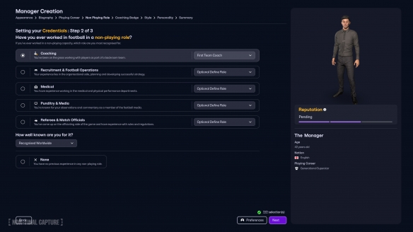 外观自定义的预设数量增加,视觉效果提升。玩家可以更细致地调整发型、面部造型与服装质感等细节。服装搭配也更为自由,玩家能以更自然的视角打造属于自己的经理人形象。资历设定中除球员资历外新增了教练、医疗以及裁判等“非球员经历”选项,让经理人的背景更加丰富。这些选项将直接影响开局时的声望与能力数值,决定职业生涯的发展方向。