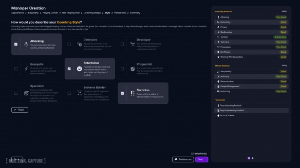 玩家还可选择经理人的领导风格与性格。这些特质会在游戏中反映为经理人的理念与执教方针,并会在职业生涯中动态变化。某些“倾向”还会随着经验积累而形成或失去,玩家在长期游玩中可感受到经理人的成长与变化。