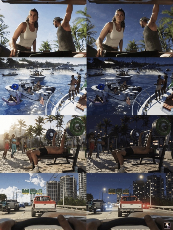 近日,国外网友分享了一张《侠盗猎车手6(GTA6)》在同一场景昼夜间的对比图,夜晚的罪城也是拥有独特魅力,让我们一起来看看吧。