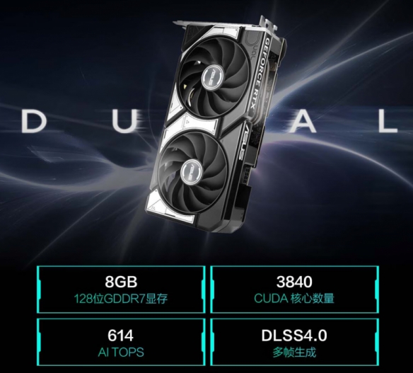 显卡部分则采用市售版本的DUAL GeForce RTX 5060。作为加速游戏体验的另一关键输出装备,拥有8GB GDDR7大容量显存、并提供高达614 TOPS AI算力。在与英特尔酷睿Ultra 5处理器225F的相互搭配下,可无压力流畅运行市面上各类主流热门3A游戏、为本地对话模型、AI视频剪辑抠图等场景应用提供充足算力。在显卡的细节设计上,研发团队为其配备了两枚轴流风扇,并采用2.5插槽设计,不仅占用空间更小,还能增强热风流出效率,避免内部积热导致的帧数下降。