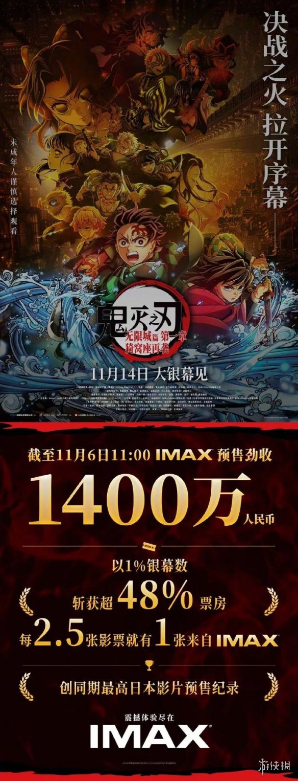 值得一提的是,截至11月6日11:00,本片的IMAX票房就达到了1400万,意味着其IMAX票房达到了总票房的48%,每2.5张影票就有1张来自IMAX,创造了同期最高日本影片的预售记录。这主要得益于影片优秀的音画制作水平,在IMAX影厅能够获得远超普通影厅的视效体验。