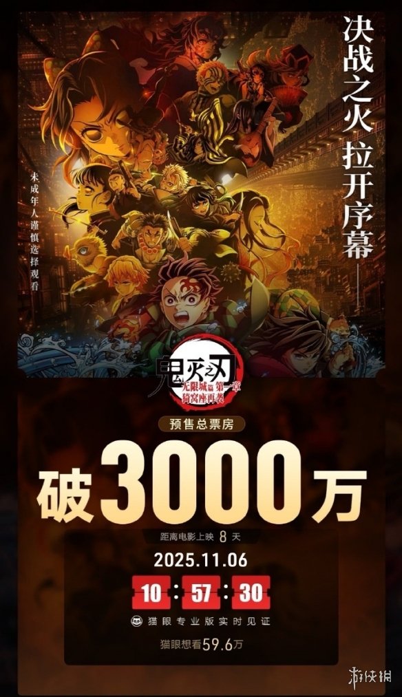 根据猫眼专业版数据,《鬼灭之刃 无限城篇》虽然刚刚宣布引进,距离上映还有8天的时间,但是其点映及预售总票房已破3000万。