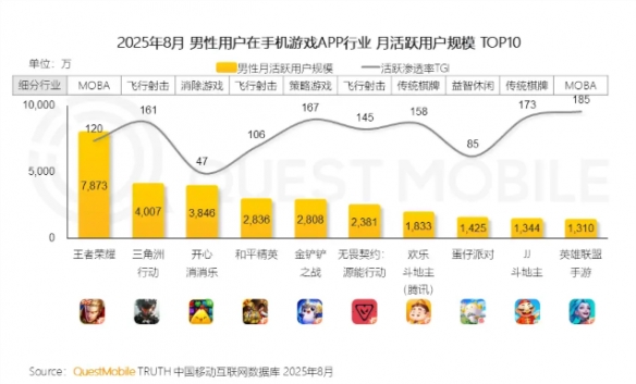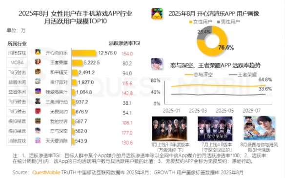 在细分领域,竞技类与策略类游戏持续占据主导地位。头部产品《三角洲行动》与《无畏契约:源能行动》月活均突破3000万,凭借沉浸式体验与高互动社区生态,在90后与00后用户中渗透率显著。用户结构呈现明显分化:男性偏好MOBA、飞行射击等竞技品类,女性则更青睐《开心消消乐》《恋与深空》等模拟经营与益智休闲游戏。