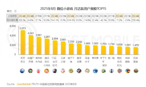 小游戏市场呈现爆发式增长,千万级月活产品增至28款。其中《无尽冬日》月活达5073万,《向僵尸开炮》《三国:冰河时代》等新产品通过融合轻度休闲与中重度玩法,成功打开市场。这类"中度化玩法"产品既满足碎片化娱乐需求,又保留足够玩法深度,成为微信小游戏增长的核心引擎。