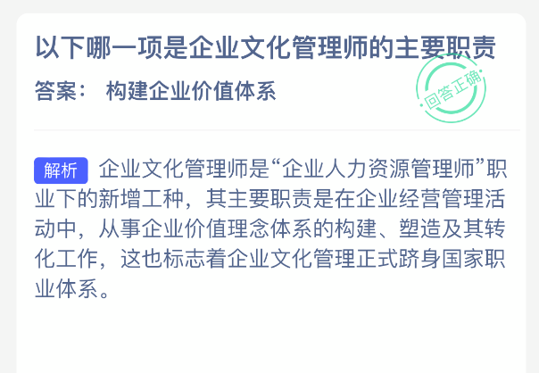 以下哪一项是企业文化管理师的主要职责?【蚂蚁新村每日一题】2025年12月7日题目已发布!坚持答题,积累木兰币,即可加速小镇建设。答对本题,立即可享“产速+3/时”的加速奖励!今天正确答案是【构建企业价值体系】。构建企业价值体系是企业文化管理师的主要职责.