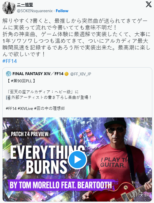 愤怒机器(Rage Against The Machine)乐队吉他手汤姆·莫雷洛近日为《最终幻想14》创作新曲,实现了该游戏作曲家祖坚正庆长久以来的梦想。