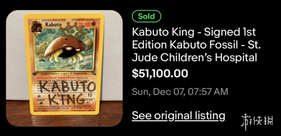 2025年12月4日至7日,他在eBay平台发起了一场专属拍卖,标的物正是一张由他本人亲笔签名的初版“化石盔”卡牌。这张承载着收藏家个人印记与慈善初衷的卡片,最终吸引了激烈竞价,并以超过5万美元的“天价”落槌。