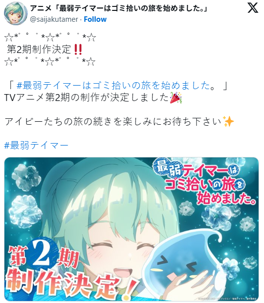 电视动画《最弱魔物使开始了捡垃圾之旅》的官方X(前推特)账号于周三宣布,该动画将制作第二季。