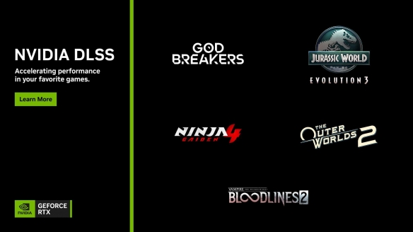 超过800款游戏现已支持RTX技术。本周《天外世界 2》(The Outer Worlds 2)、《吸血鬼:避世血族 2》(Vampire: The Masquerade - Bloodlines 2)和《侏罗纪世界:进化 3》(Jurassic World Evolution 3)将首发支持DLSS 4。《忍者龙剑传 4》(NINJA GAIDEN 4)现已支持DLSS超分辨率。