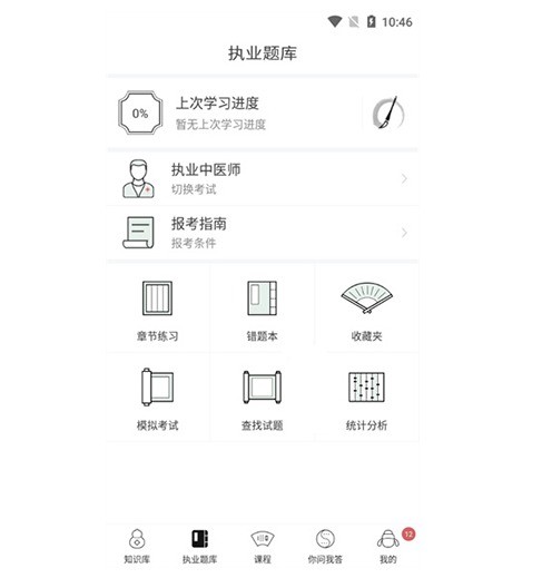 进入中医通APP,在主界面中找到并点击【执业题库】图标,进入题库功能页面。