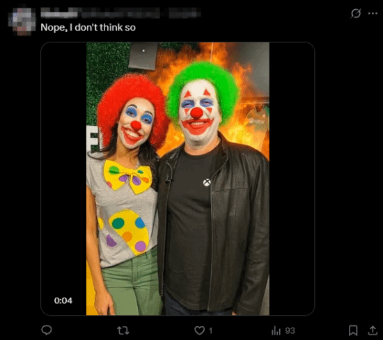今日,Xbox官方宣布将参展10月于曼谷举办的Gamescom asia X泰国游戏展,并以“2025年的旅程还没有结束”为题,试图为玩家注入信心。然而,这条充满期待的公告却意外点燃了玩家社群积压已久的怒火,评论区迅速被网友制作的“小丑”图片占领——Xbox负责人菲尔·斯宾塞与莎拉·邦德总裁的面孔被P上了小丑妆容,场面一度十分尴尬。