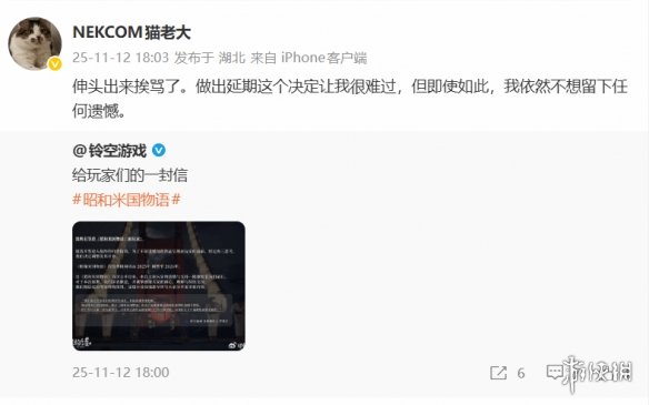 国产RPG游戏《昭和米国物语(Showa American Story)》宣布延期至2026年发布。游戏制作人猫老大转发延期声明并发文致歉。