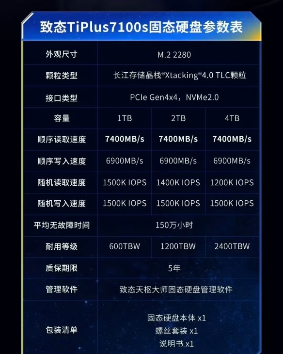 该硬盘顺序读取速度达7400MB/s,顺序写入速度为6900MB/s。其核心升级在于搭载长江存储新一代晶栈® Xtacking® 4.0闪存颗粒,具备更高存储密度、更快I/O速度及更可靠的品质。