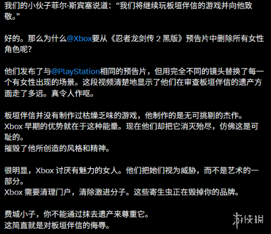 近日,国外游戏推主@HaileyEira发文抨击Xbox负责人菲尔·斯宾塞,直言他不配向已故的《死或生》《忍者龙剑传》系列创始人板垣伴信致敬,因为Xbox并没有尊重他的“遗产”,审查删改了游戏预告片中的内容。