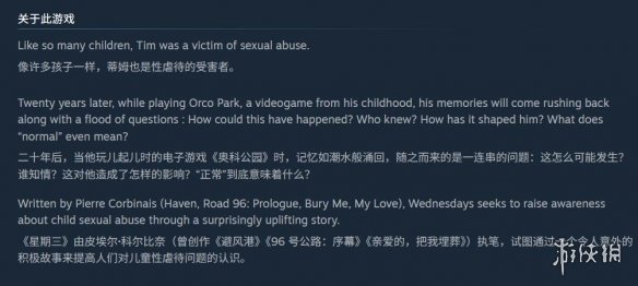 《星期三(Wednesdays)》是一款具有社会关怀意义的叙事探索游戏,游戏讲述了主角蒂姆在成年后,通过重温童年游戏《奥尔科公园》,逐渐唤醒并修复其被压抑的童年创伤记忆的过程。