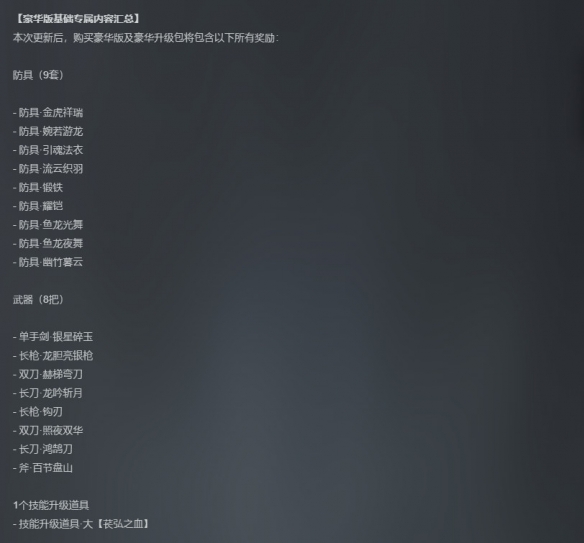 购买豪华版或豪华升级包的玩家将获得3套全新防具与2把新武器,包括"鱼龙光舞"、"鱼龙夜舞"防具套装,以及"鸿鹄刀"长枪和"百节盘山"战斧。至此,豪华版内容已完整包含9套防具与8把武器,玩家可在游戏内的普元寺功德箱领取全部奖励。