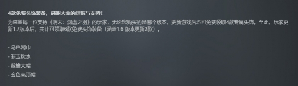 为感谢广大玩家的支持,开发团队为所有玩家准备了4款免费头饰装备:"乌色网巾"、"寒玉秋水"、"敝檐大帽"和"玄色高顶帽"。加上此前版本的内容,玩家现可领取共计6款免费头饰。
