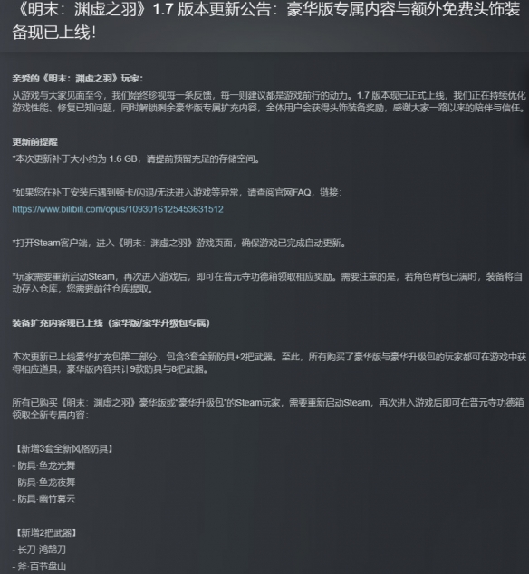 游戏《 明末:渊虚之羽 (WUCHANG: Fallen Feathers)》今日正式推出1.7版本更新,为玩家带来豪华版专属扩充内容与多项免费福利。本次更新补丁约1.6GB,已在Steam、PS5及Xbox平台同步上线,其余平台将在近日陆续更新。