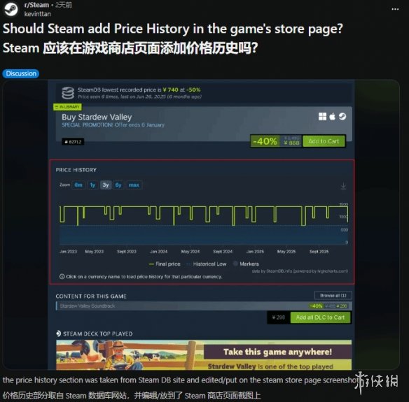 发帖者将价格历史记录模拟嵌入Steam商店页面的展示表明,游戏的价格变动情况能够一目了然,这对玩家作出购买决策无疑具有重要参考价值。诸如SteamDB等第三方数据平台,正是凭借其详尽的价格变动记录,成为了备受玩家青睐的查询工具。