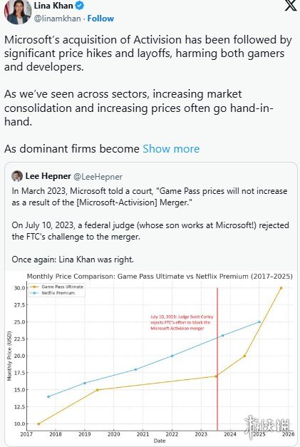 律师李·赫普纳在社交媒体引用微软此前"收购后不会涨价"的声明,并附图表显示交易完成后会员费涨幅明显。FTC前主席莉娜·汗转发该帖并指出:"市场垄断程度与价格攀升总是如影随形,占据支配地位的企业往往会在损害消费者利益时有恃无恐。"