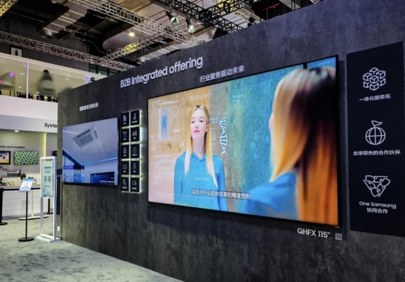 在商显产品展区,三星以高端显示构建智慧商业新生态。现场展出的115英寸QHFX智能数字标牌与彩色电子纸E-Paper EMDX系列产品凭借领先技术与完善的解决方案,成为信息传递与场景交互的关键载体。前者支持横向与纵向两种安装方式,灵活适配不同场景需求,34.1毫米的纤薄机身提升了空间美观度。后者则展现了商显产业绿色发展的新方向,17.9mm的超薄机身设计极具科技美感,接近纸质的视觉体验让观众倍感舒适。通过三星彩色成像算法和E Ink Spectra 6技术,该系列产品在32英寸、2560×1440分辨率的屏幕上,能够以极低的功耗持久展示细腻逼真的画面。三星商显产品的技术突破与场景拓展为全球商显产业的创新升级提供了标杆示范。