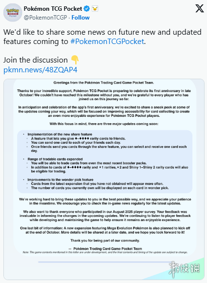 为迎接本月下旬即将到来的一周年庆典,《宝可梦卡牌Pocket》宣布将通过一次重大更新,加入多项玩家期待已久的新功能与优化。本次更新将首次支持玩家直接向好友分享卡牌,同时面向收藏玩家的“奇迹挑选”功能也将迎来实用性升级。
