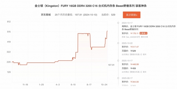 今年以来,内存价格持续暴涨,特别是DDR4内存,价格暴涨超过两倍,16GB条已突破500元。根据慢慢买App数据显示,一款金士顿DDR4 16GB台式机内存条的售价已从去年同期的178元涨至517元,涨幅超过两倍。