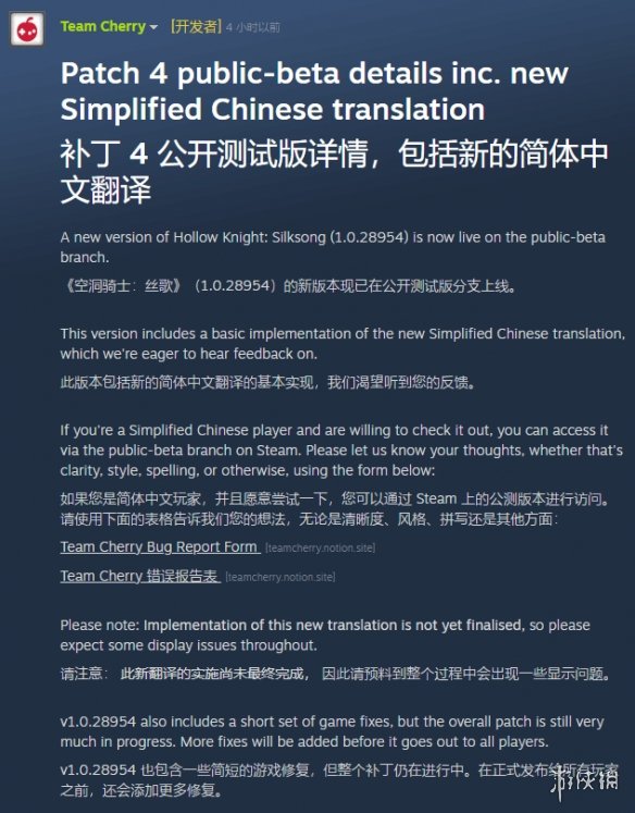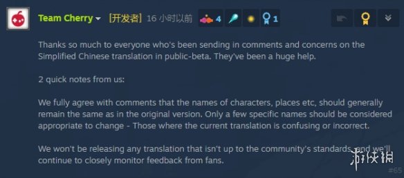 Team Cherry在回应中表示:“衷心感谢所有对公测版简体中文翻译提出意见和关切的朋友,这些反馈对我们帮助极大。