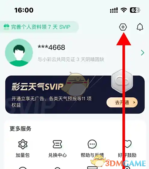 1、打开彩云天气软件,进入我的页面,点击上面的图标,