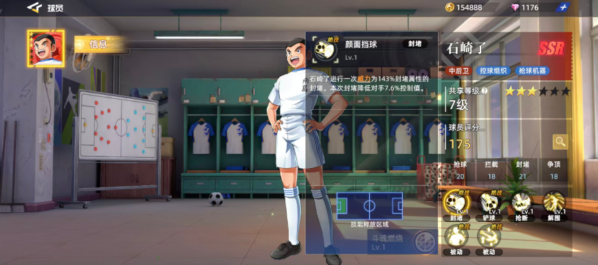 另外在飞身铲断这个技能上面,石崎了带来的是一次威力为143%铲球属性的铲球,因为本身他的抢球动作就比较多,这里利用这样的铲球动作就可以增加5.7%爆发属性,也让石崎了有更多的抢球成功概率,其次在奋力抢断这个技能当中,石崎了是会发动威力为120.2%抢断属性的抢断,这里的话大家也可以看作是一个抢球权的动作,而聚焦争顶的技能则是根据石崎了的基本属性,带来数值为120.2%争顶属性的动作,所以在这几个技能使用的方面,大家只要依靠他的基础数值以及技能当中带来的百分比就可以更快获取我方的球权移动效果。
